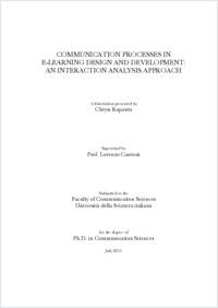 The present dissertation has as a main goal to identify and describe relevant design and communication processes taking place during co-design meetings, in a way suitable to inform practice in similar settings in the field of eLearning design and development. The need for such a research emerges from the inadequacy of prescriptive models that can guide professionals in their communication during the design of on-line courses. This inadequacy has been evident also in other design fields, thus a tendency towards empirical team design research has been recently established. In the margins of this research tendency, several different methods of analyzing how a team actually interacts during design have been hitherto proposed. Our research applies an Interaction analysis approach, akin to take into consideration various aspects of both the design and communication processes taking place in parallel during a professional co-design meeting. Such an approach allows for the study of the team’s double focus during task-oriented interaction: the realization of the task on which interaction focuses on, and the task of communicating about it. Thus, on the basis of viewing team design activity mainly as a socio-cognitive interaction activity, a method of corpus construction and analysis is proposed, namely DROMEAS. DROMEAS takes its name from the coding dimensions to which it refers, namely: Design activity, Representational act, Object, Meta-epistemic reference, Dialogue act, and dialogue sequence. The selection of these dimensions over others is based on the theoretical constructs this dissertation addresses, which are: design co-construction, dialogicality, deliberativeness, intermediary representations, design-related arguments, and user experience. Applying DROMEAS to an extended dataset (7625 interaction units) derived from 15 co-design meetings of two teams – as representative of high reputation European Distance Universities – has led to several insights and observations regarding both the team design practice in the field of eLearning, and the adequacy of DROMEAS as a method to gain such insights. As far as the former is concerned, our results refer to the structure of design and communication processes, in terms of activities, acts, and objects involved, the content “put on the table”, the arguments produced, and the task-related emerging roles. Regarding the latter, methodological considerations such as the adequacy of dialogue acts, instead of speech acts, to describe interaction, the argumentation schemes emerged, and the merging of semantic-cognitive and dialogical aspects regarding communication acts are discussed. As a conclusion, it is found that the design and the communication processes are mutually dependent, and both depend of the team goal appearing as predominant at each instance of interaction. The selection of an Interaction analysis approach has been proven adequate to richly describe team interaction at various levels and through different focuses. Finally, the identification of argumentation schemes in a naturally emerging dataset has been possible, and also the relation between arguments and design-relevant representations – such as proposals, constraints, and requirements.