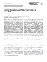 The standard model (SM) production of four top quarks ( ) in proton-proton collisions is studied by the CMS Collaboration. The data sample, collected during the 2016-2018 data taking of the LHC, corresponds to an integrated luminosity of 137 at a center-of-mass energy of 13 . The events are required to contain two same-sign charged leptons (electrons or muons) or at least three leptons, and jets. The observed and expected significances for the signal are respectively 2.6 and 2.7 standard deviations, and the cross section is measured to be . The results are used to constrain the Yukawa coupling of the top quark to the Higgs boson, , yielding a limit of at confidence level, where is the SM value of . They are also used to constrain the oblique parameter of the Higgs boson in an effective field theory framework, . Limits are set on the production of a heavy scalar or pseudoscalar boson in Type-II two-Higgs-doublet and simplified dark matter models, with exclusion limits reaching 350-470 and 350-550 for scalar and pseudoscalar bosons, respectively. Upper bounds are also set on couplings of the top quark to new light particles.